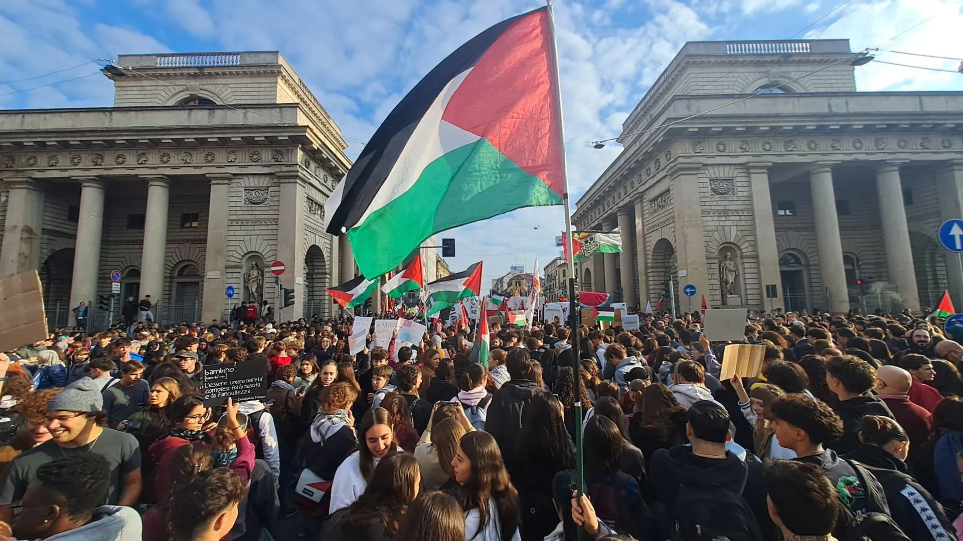 A Milano il corteo è partito da Porta Venezia e, mentre la testa già vede piazza Leonardo Da Vinci — dove terminerà, di fronte al Politecnico — la coda deve ancora muoversi. Gli organizzatori parlano di 30 mila perone: Una partecipazione enorme, con numeri che probabilmente aumenteranno nel corso della mattinata. I cori, in piazza, sono i soliti: “Israele fascista, Stato terrorista”, “Bella Ciao” e “Palestina libera”. Questa mattina, all’Università La Statale, gli studenti di “Cambiare Rotta” hanno bloccato gli ingressi all’ateneo.