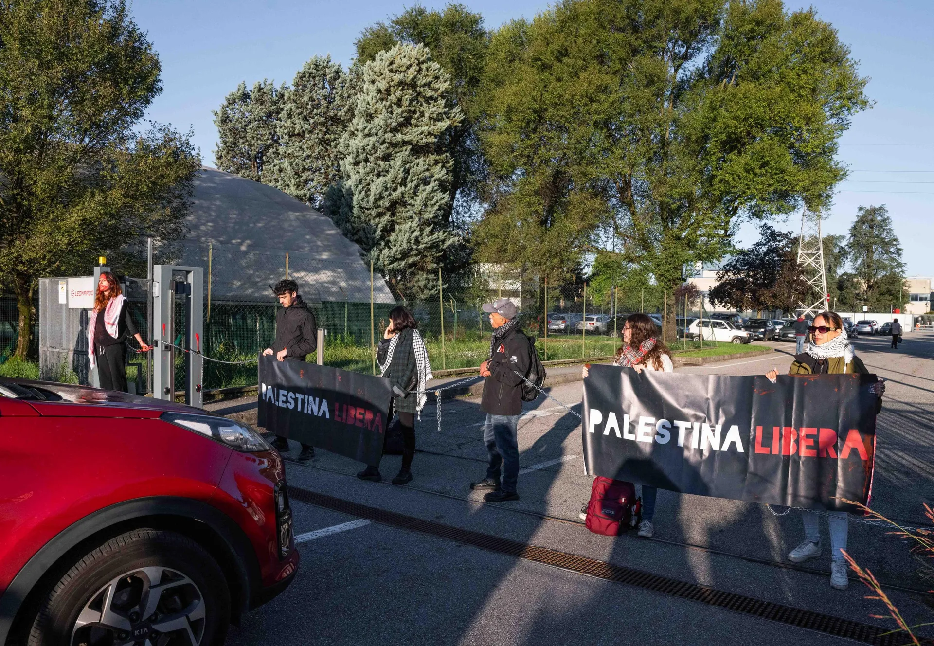 Continuano le proteste contro la vendita di componenti italiane potenzialmente utili all’esercito israeliano. Questa mattina, 29 settembre, sette attiviste di Palestine Action Italia e Ultima Generazione si sono incatenate al cancello della sede di Leonardo a Nerviano, esponendo striscioni con la scritta “Palestina Libera”.