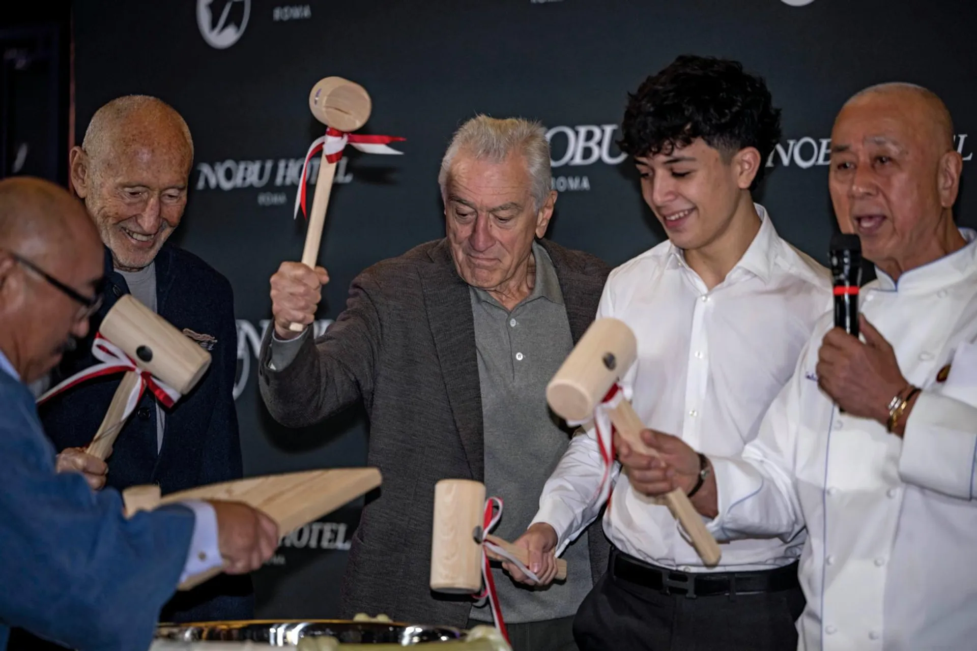 L’inaugurazione del Nobu Hotel Roma è stata infine festeggiata da Robert De Niro, Nobu Matsuhisa e Meir Teper con la partecipazione al rito giapponese del “Kagami Birakiche” ossia all’apertura di una botte di sakè, con un brindisi di buon auspicio.