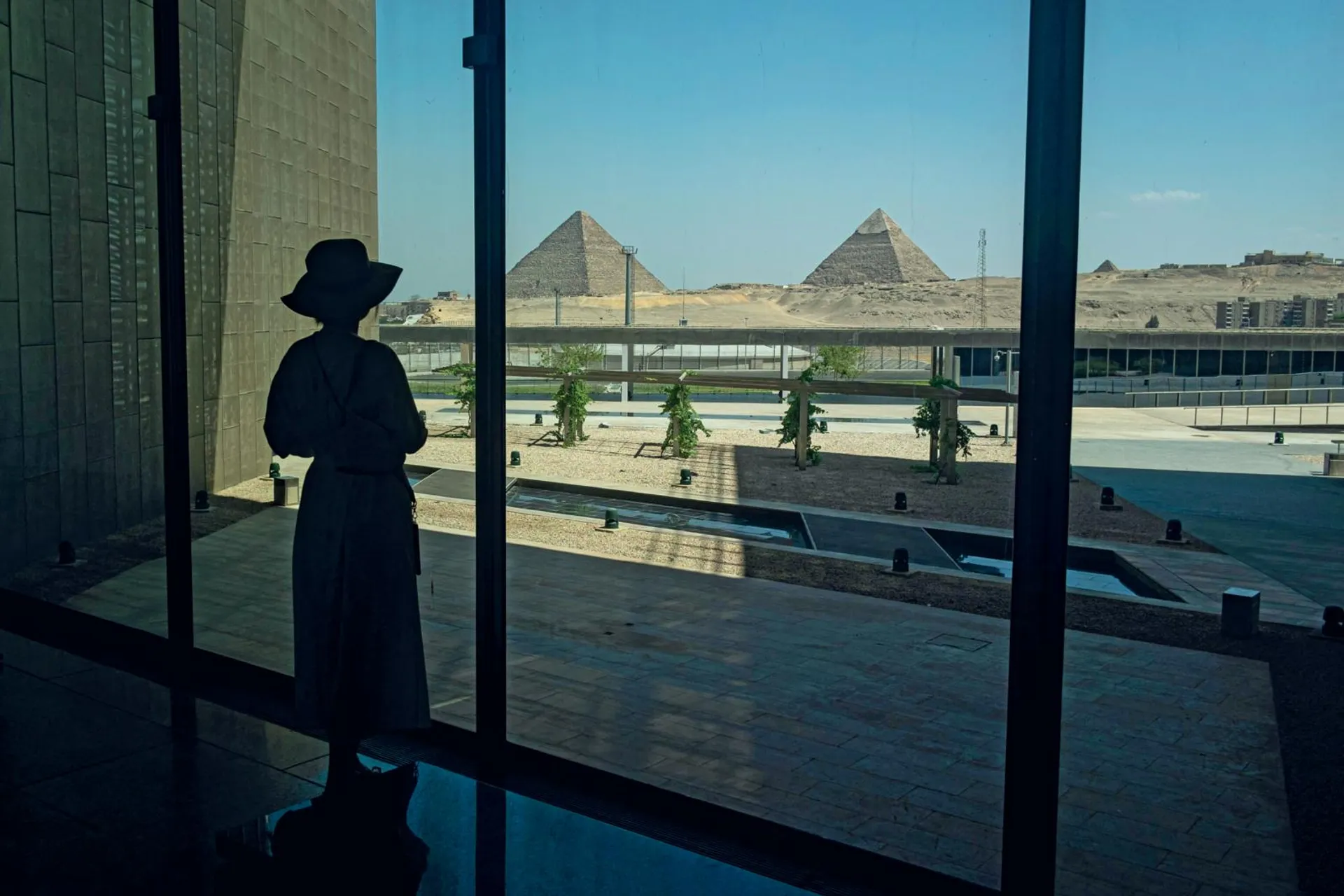 La scalinata monumentale, con statue e steli disposte lungo le rampe, si sviluppa come una gigantesca didascalia della filosofia espositiva del museo. Dove i reperti non sono organizzati cronologicamente, ma disposti in modo da offrire un’esperienza attraverso quattro macro-temi: la rappresentazione della regalità, con sculture di sovrani come Akhenaton, che abbandonò il politeismo egizio per imporre una religione basata sul culto del dio Aton, il disco solare, e di Hatshepsut, la prima donna faraone e una delle più potenti figure del mondo egizio classico; il rapporto del faraone con il popolo, con l’esposizione di elementi architettonici provenienti da antichi templi; la relazione del faraone con gli dei, i doni e i riti in cambio della loro protezione; il viaggio verso l’eternità, dedicata ai sarcofagi di epoche e fatture diverse. Più in alto di tutto la prospettiva sul deserto, con grandi vetrate a incorniciare una delle sette meraviglie del mondo.