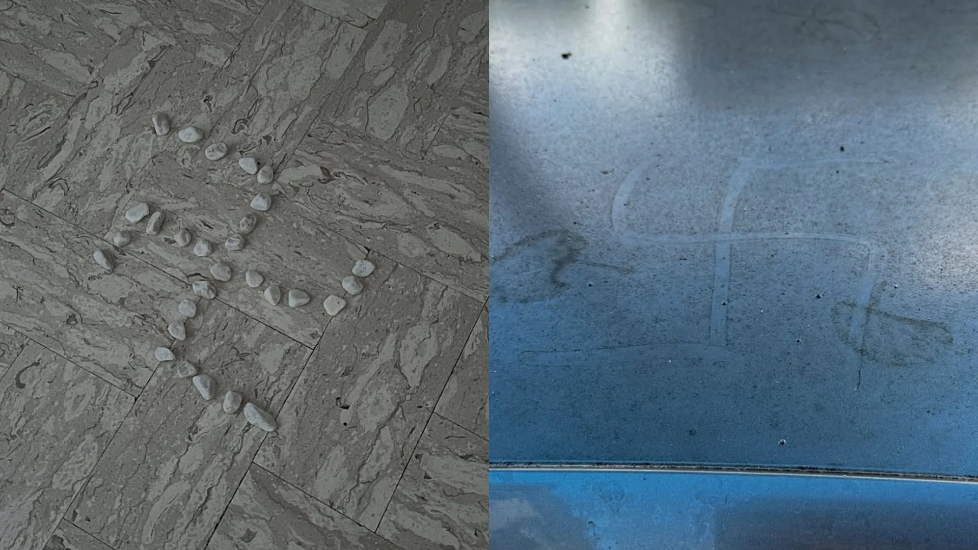 25 novembre, 2025La prima disegnata a mano sull'auto, la seconda fatta con dei ramoscelli e la terza con dei sassi di fronte al pianerottolo dell’appartamento dove vive con la famiglia