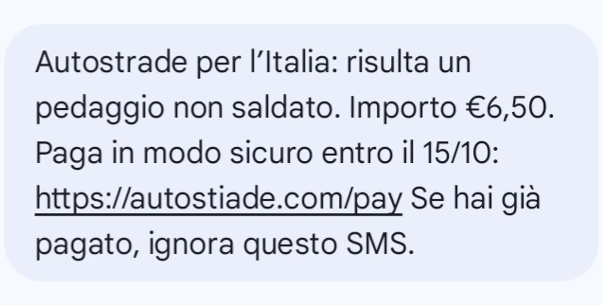 L’allarme arriva dal Computer Emergency Response Team dell'Agenzia per l'Italia Digitale (Cert-Agid) a seguito delle segnalazioni dei cittadini. È in corso una massiccia campagna di smishing, veicolata con un Sms che va dritto al punto: "Autostrade per l’Italia: risulta un pedaggio non saldato". Segue un minimo importo - di circa 6,50 euro - e il termine entro cui bisogna provvedere al saldo. E per chi volesse subito "togliersi il pensiero", c'è anche il link per il pagamento. I truffatori ci sanno fare, il messaggio chiude infatti con un laconico: "Se hai già pagato ignora questo SMS”.
