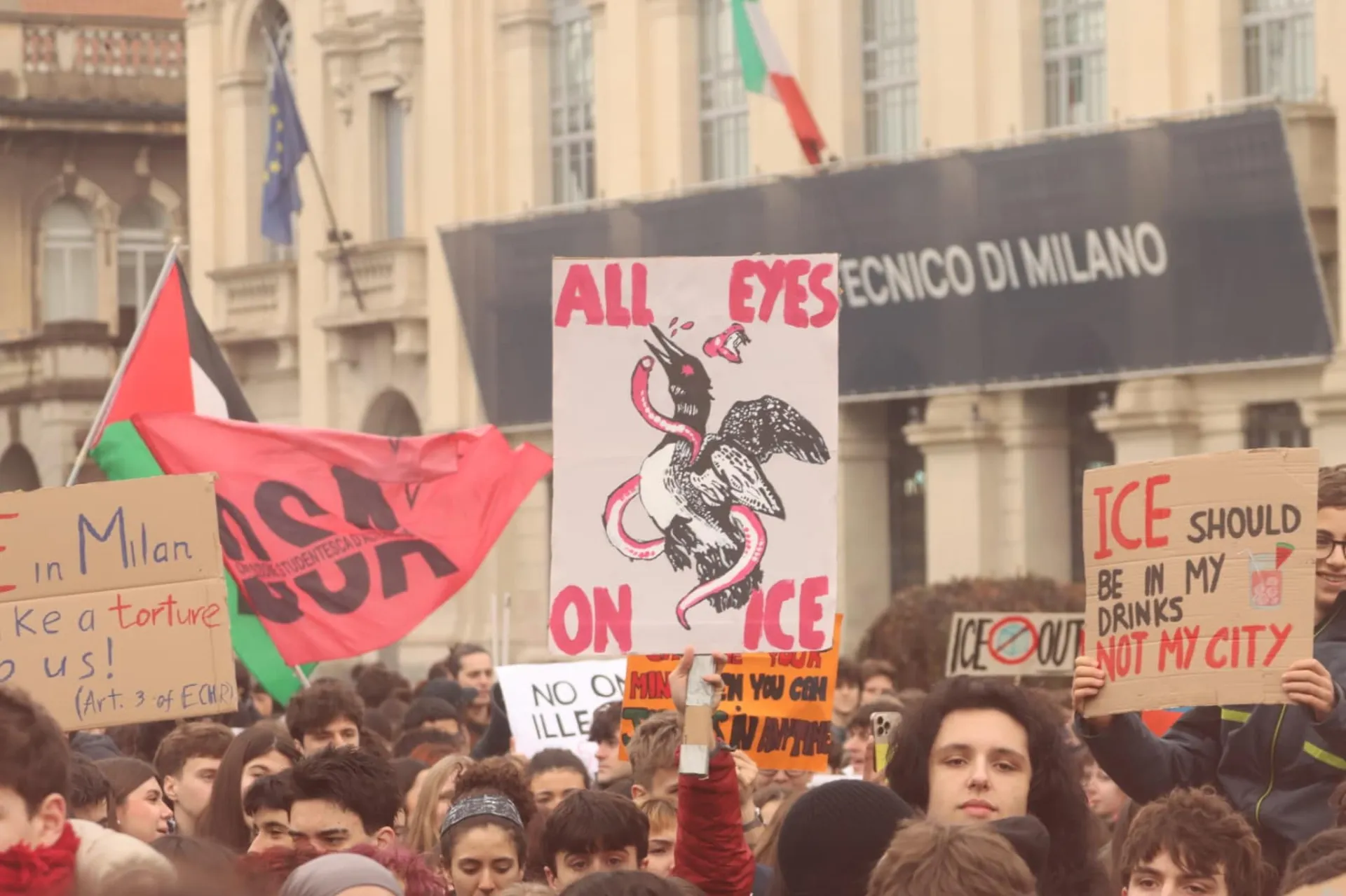 Alle manifestazioni contro la presenza dell'Ice a Milano Cortina si è aggiunta un'altra protesta. Questa volta a scendere in piazza sono stati soprattutto gli studenti, che hanno occupato il parco davanti al rettorato del Politecnico di Milano (in Piazza Leonardo da Vinci) con striscioni e slogan contro la polizia anti-immigrazione di Donald Trump.